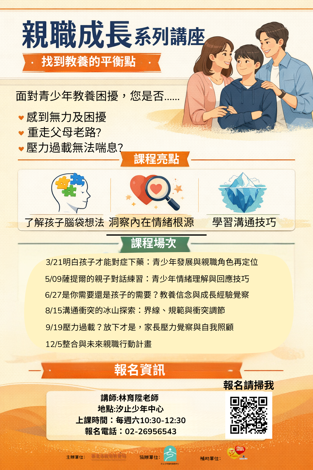 一、青少年時期為個體發展自我認同之關鍵階段,家庭系統常因角色轉型與溝通落差面臨挑戰。為提升青少年家長之心理韌性、增進親子對話技巧並促進家庭和諧,本會特規劃旨揭系列課程本活動。